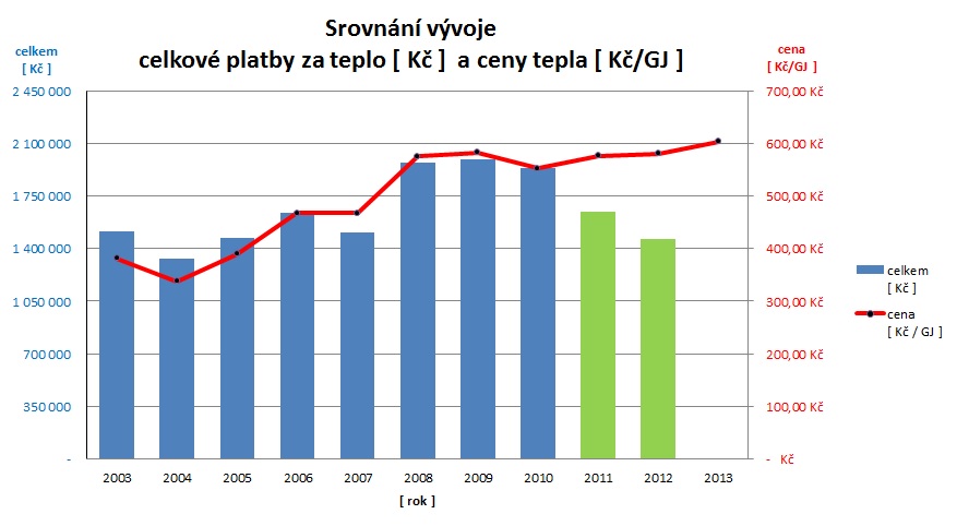 Domovní správa Prostějov, s.r.o., která je naším dodavatelem tepla a teplé vody, v loňském roce hospodařila lépe, než byla původní finanční kalkulace. Výsledná cena tepla byla nakonec o 0,38% nižší než oznámená předpokládaná cena tepla pro rok 2012. Došlo tedy k úpravě ceny z 583,20 Kč/GJ na konečných 580,99 Kč/GJ.