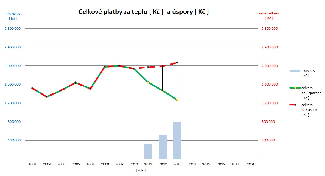 V absolutním finančním vyjádření jsme dokázali uspořit za rok 2012 celkem 520 tis. Kč. Společně s rokem 2011 činí kumulovaná úspora již 850 tis. Kč. V roce 2013 očekáváme úsporu dalších cca. 800 tis. Kč, která se bude postupně v dalších letech nadále zvyšovat. V grafu předkládáme srovnání vývoje celkových plateb za teplo bez a s realizovaným zateplením a zobrazení ročních úspor: